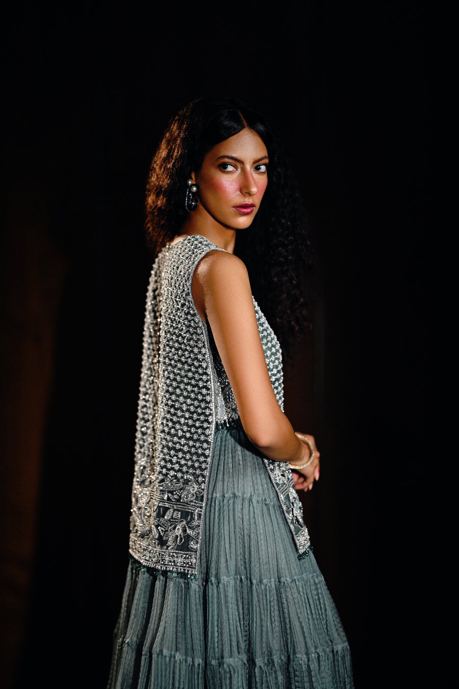 A stunning statement piece , this is a favourite from the collection . Ideal for weddings and special occasions , the short shirt is fully worked and the crushed lehangha contrasts beautifully with the vibrant hues of the shirt , making it a perfect match for any celebration .