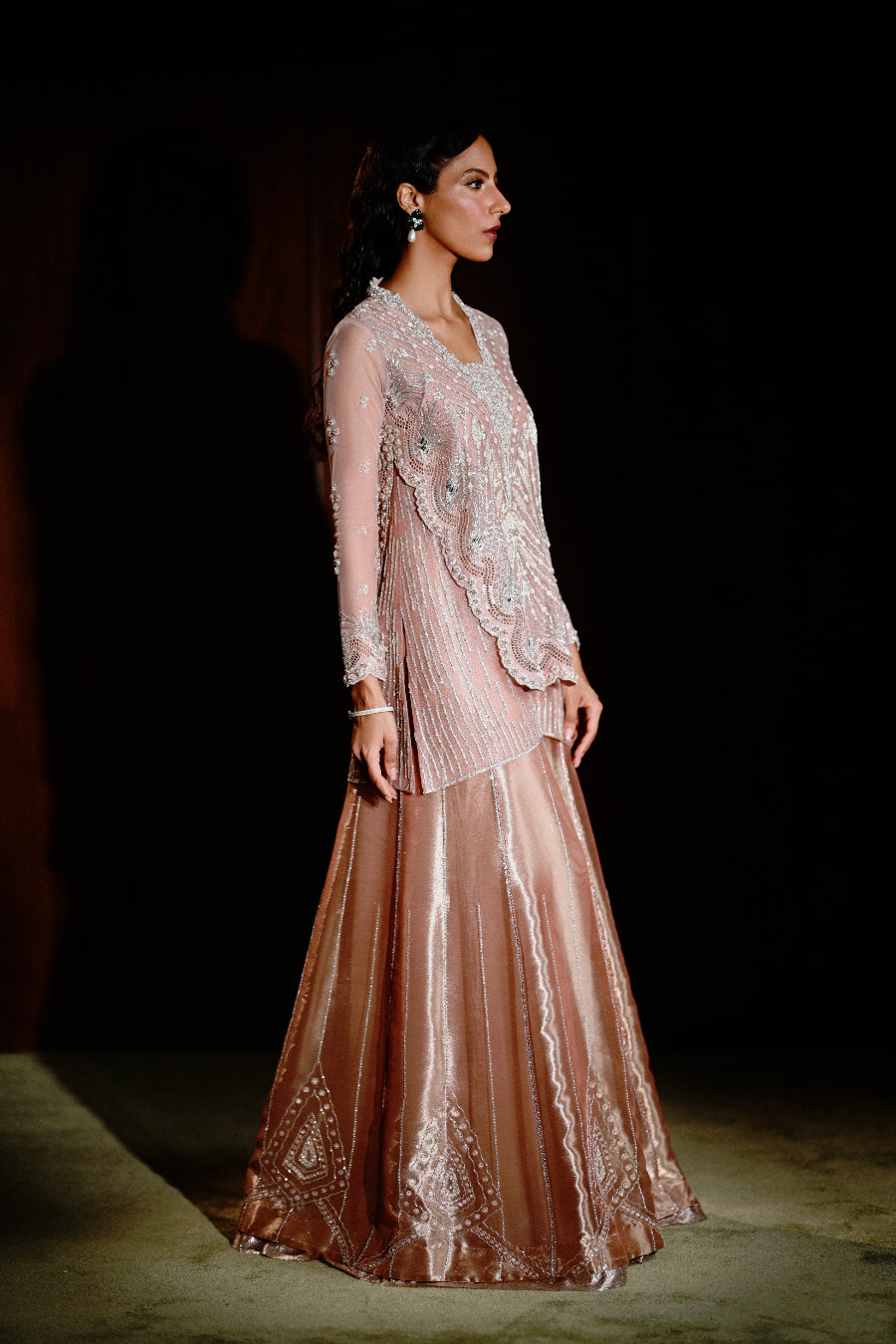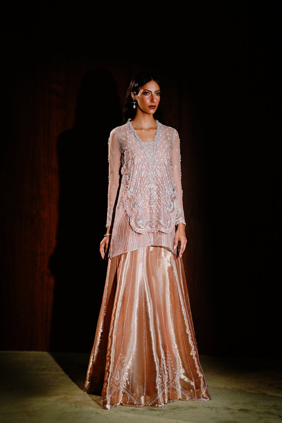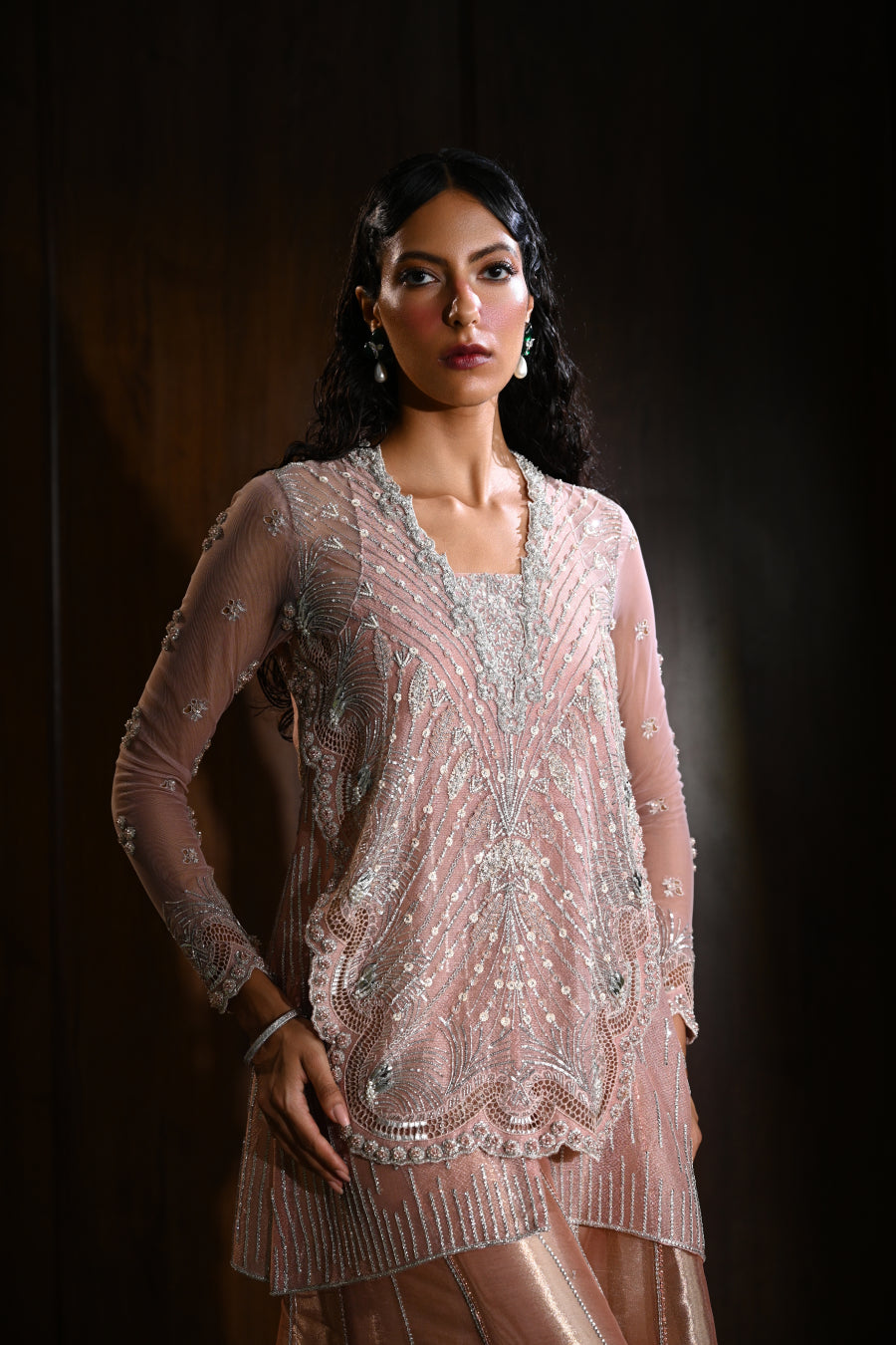 A double layered shirt in a soft peach hue , exuding a romantic and sophisticated vibe . The outer layer is adorned with silver and thread work , the inner layer slightly longer , creating a beautiful layering effect . To complete this look , the shirt is paired with worked Dhaka pants .