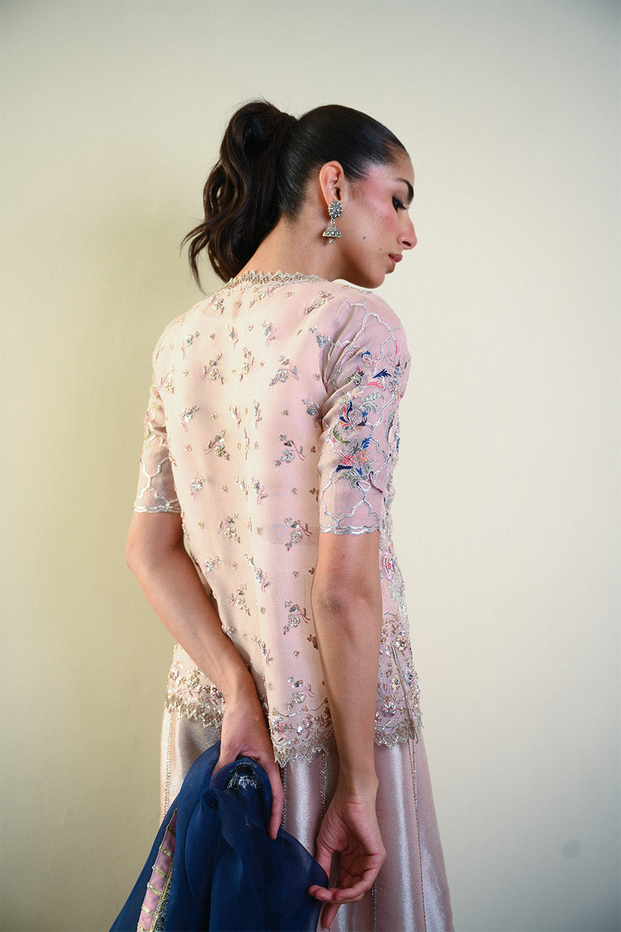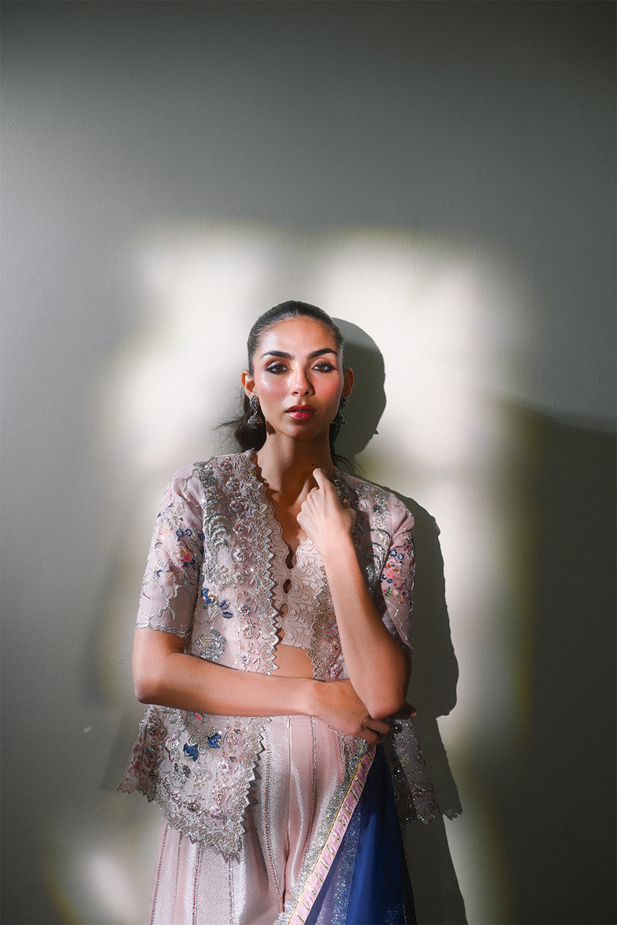 This exquisite short pink organza jacket combines multi embroidery and silver swarovski paired with a worked dhaka and delicate lace choli . The blue organza duputta looks perfect with the jacket .