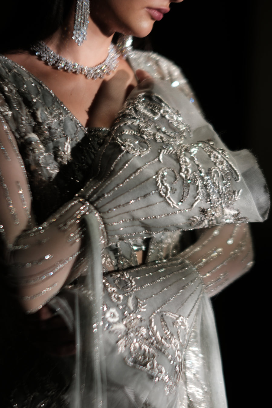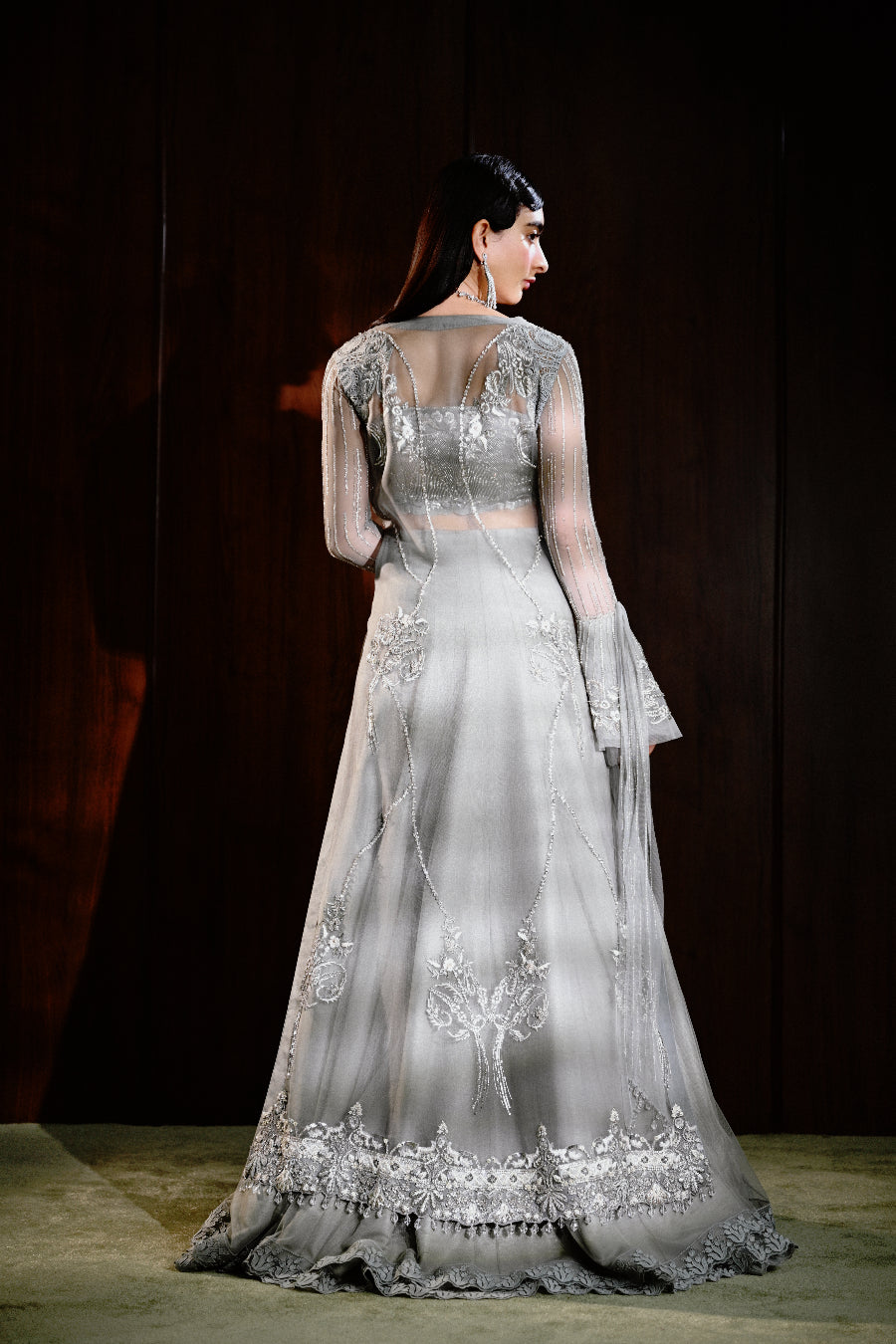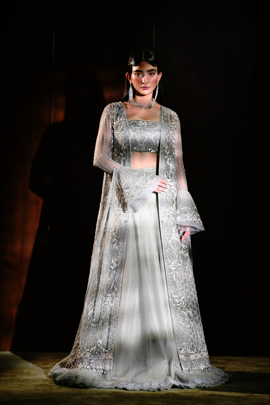 Embrace elegance and sophistication with this long light green jacket , a true statement piece that can be worn for many years to come . Paired with a choli and double layered lace edging lehangha , this is perfect for festive occasions. The combination creates a blend of tradition and modernity .