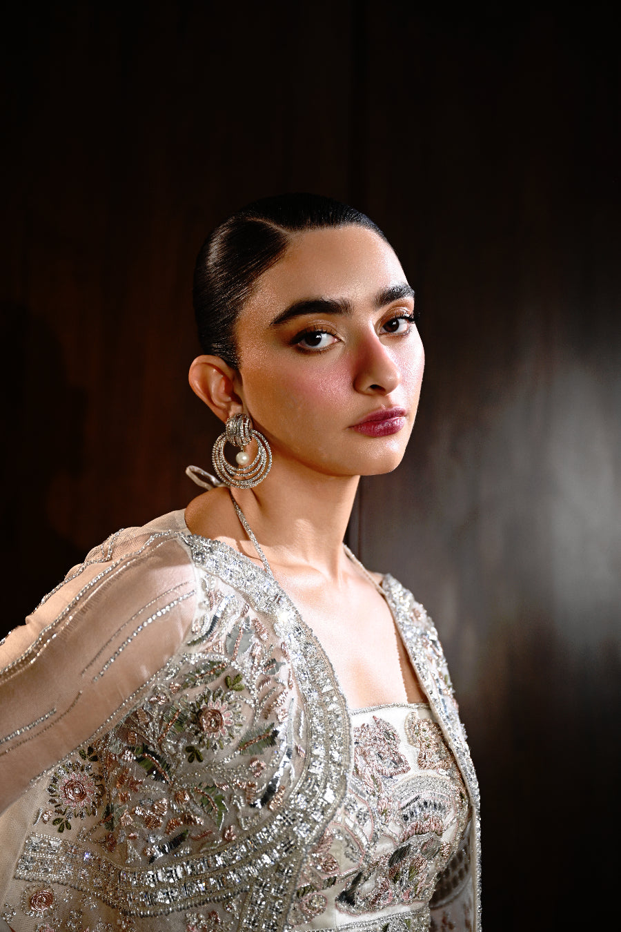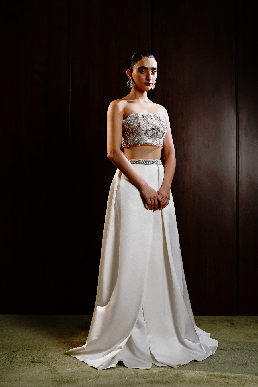 A stunning ensemble that combines tradition with contemporary flair . A short tailored white jacket adorned with silver work and pink gota . A beautifully crafted choli complements the jacket . Paired with a luxurious silk skirt to complete the look .